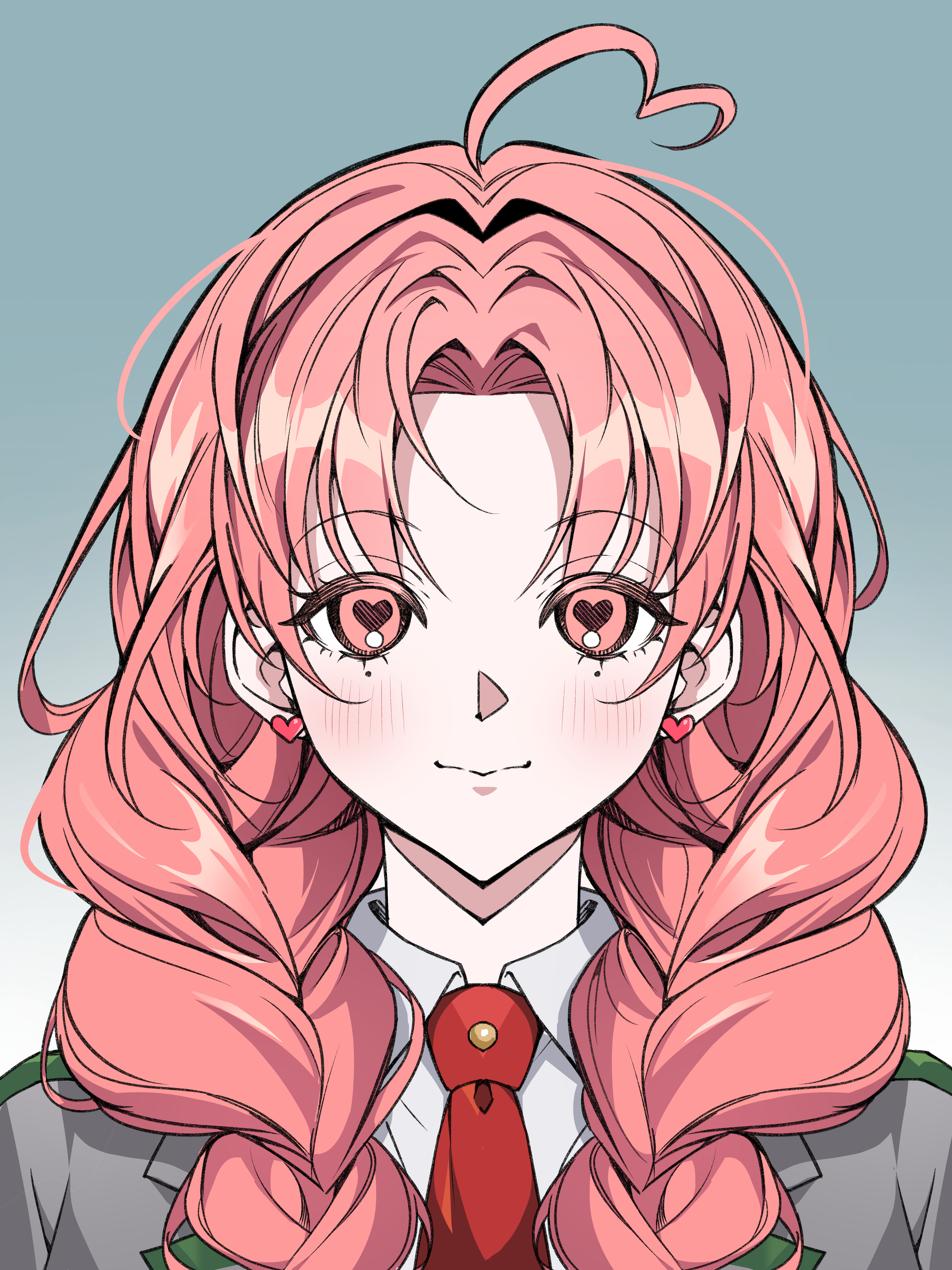 사랑의 아이콘 답게 핑크 헤어, 하트동공의 소유자. 심지어 더듬이 모양도 자세히 보면 하트다.
