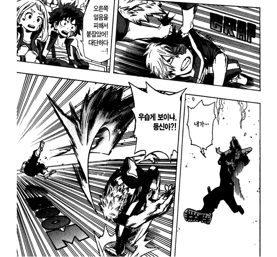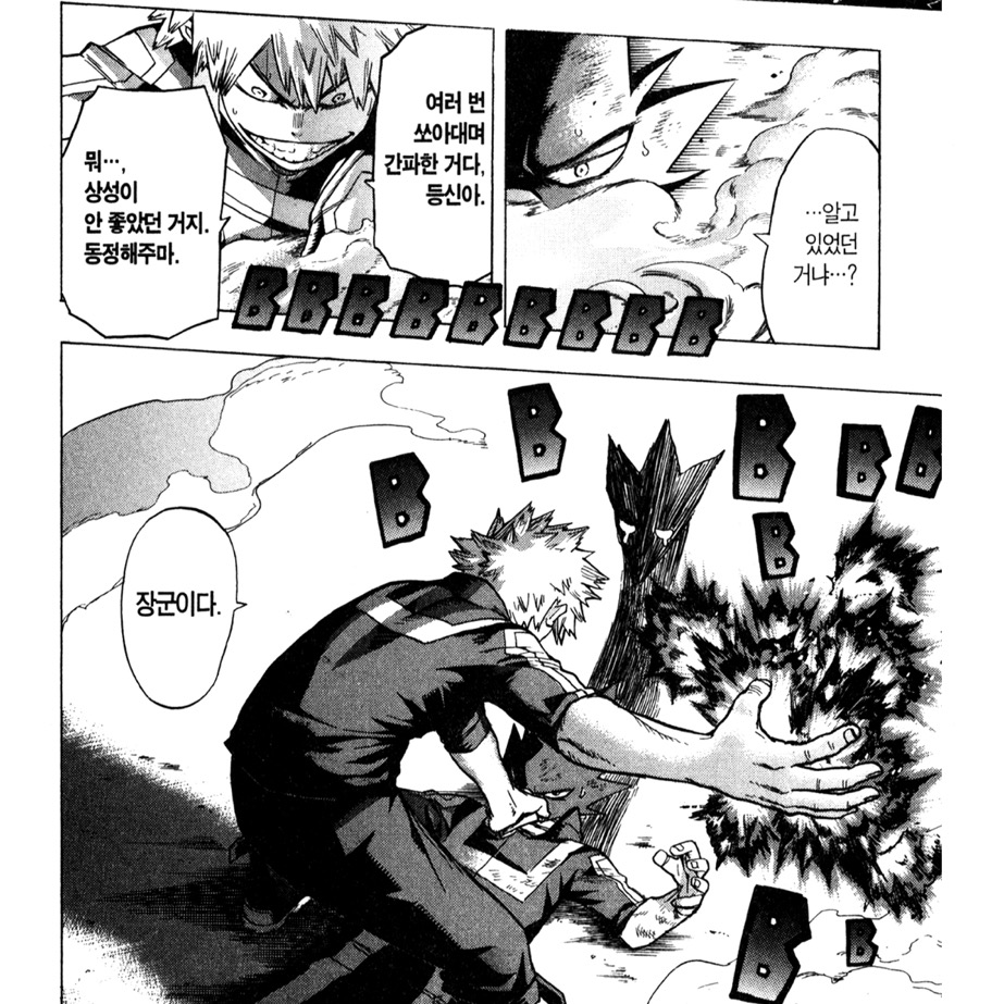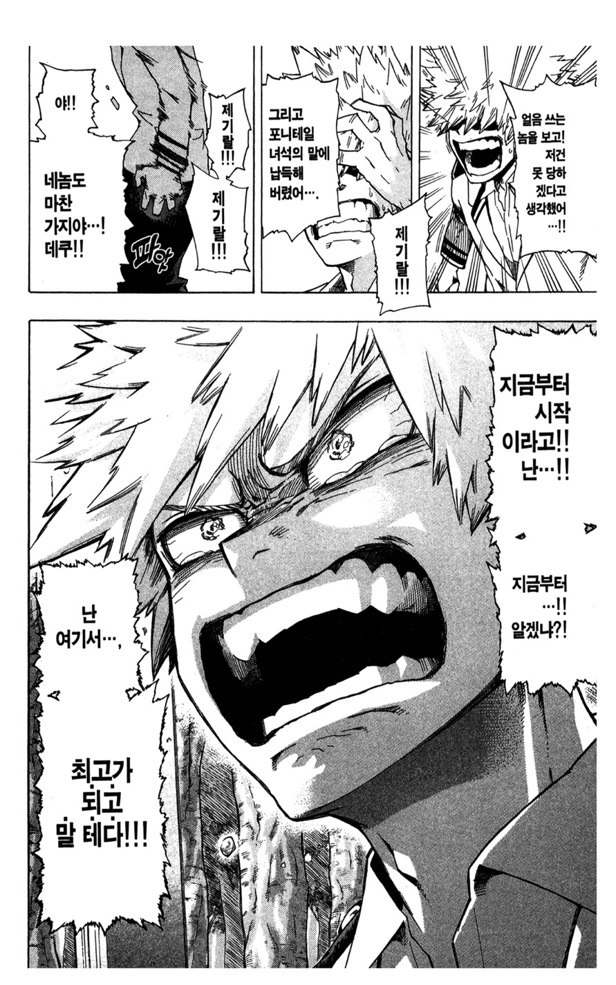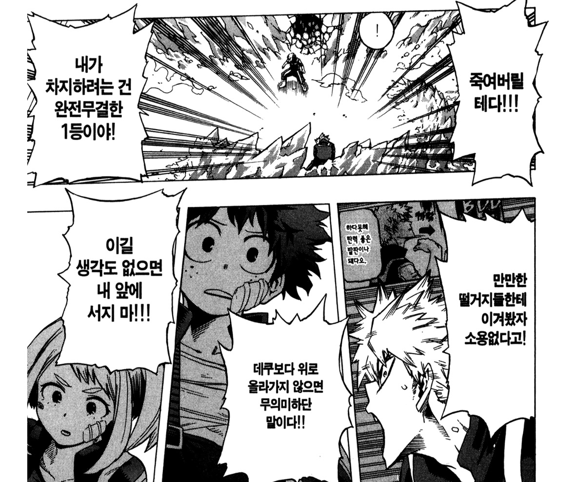실은 초반 바쿠고는 심히 폭력적이라 좋아하는 순간을 찾기가 꽤나 어려운데요. 그래도 바쿠고의 목표를 향한 열망만큼은 좋아하는지라 몇가지 순간을 찾아왔습니다.