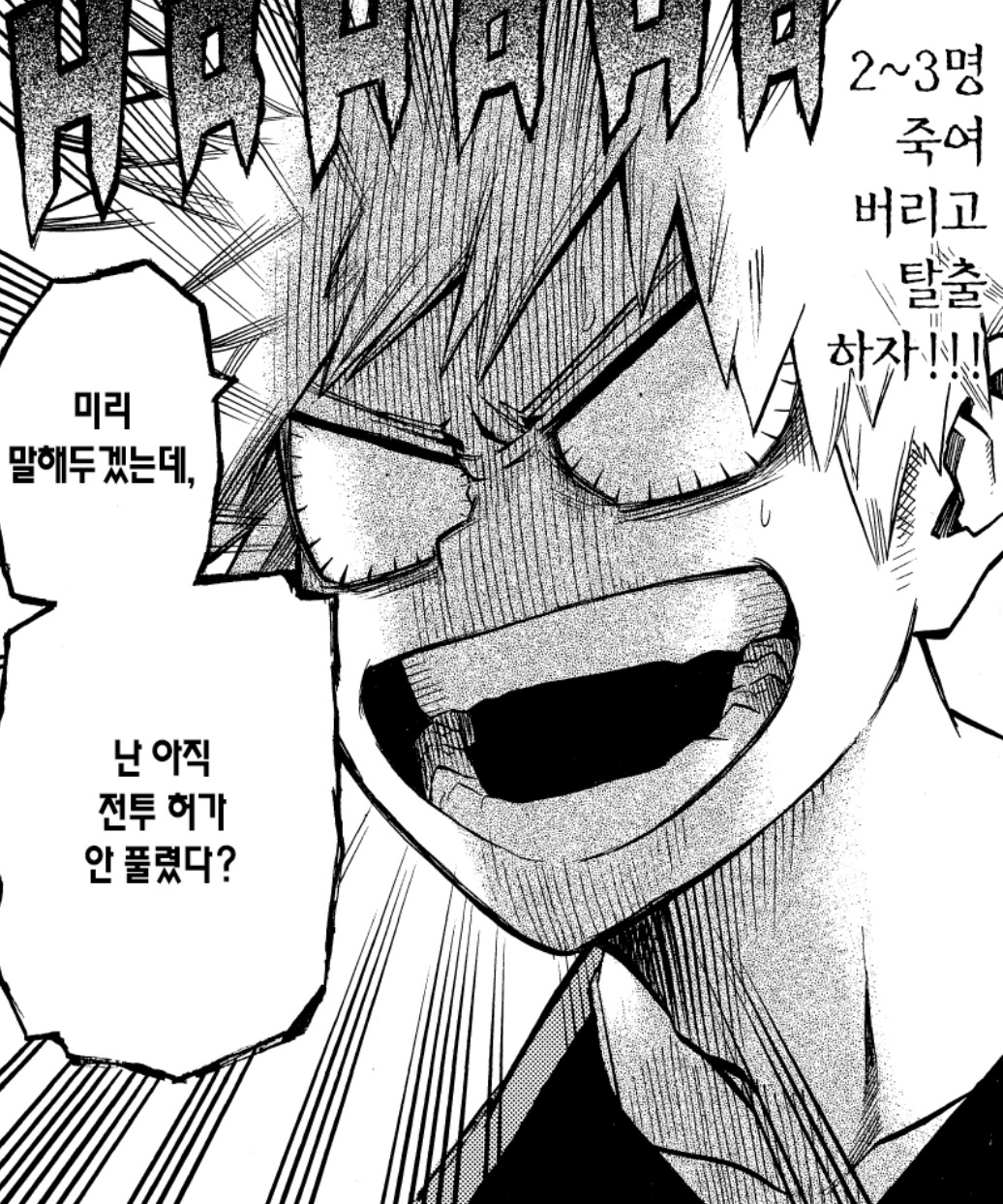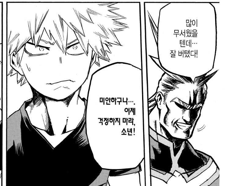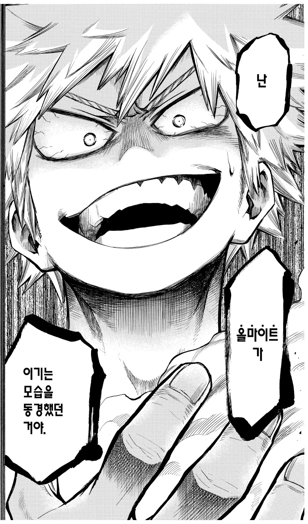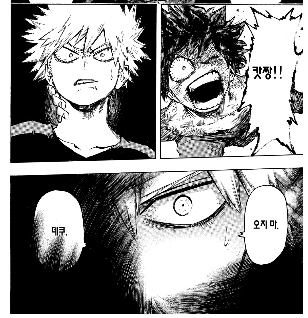 그치만 이장면을 가져온건 데쿠. 오지마 라는 대사 때문이랍니다. 미도리야에게 구해지는게 수치여서 그런말을 한건지 아니면 미도리야가 위험해지는걸 원치 않아서 그런말을 한건지 제가 답을 내릴 수는 없지만 뭐든 바쿠고의 성정이 잘 드러나는 대사라고 생각해요. 폭력적이긴 해도, 어느 한켠 누군가를 위험하게 하고싶지 않은 히어로의 자세가 있으니까요.